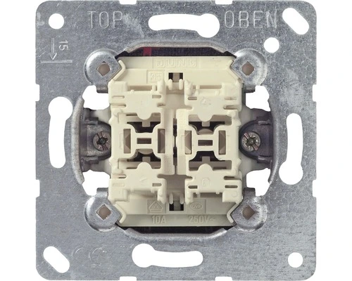 JUNG A500 Inbouw basiselement jaloezieschakelaar alpine wit 509 VU 10 AX 250 V ~ Uitgevoerd met veerklemmen voor starre kabel tot 2,5 mm². Verbindingsklemmen conform DIN VDE 0632 (EN 60 669) met omkeerblokkering (= een te snel omschakelen van de looprichting wordt betrouwbaar verhinderd). Uitvoering: schakelaar 1-polig (1 aandrijving).