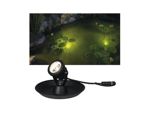 De Plug & Shine vijverlamp zorgt ook onder water voor warmwitte lichteffecten. Een metalen schijf die door de vulling met kiezel of zand onzichtbaar wordt, houdt de spot in positie. Met trafo’s, verbindingen en andere armaturen uit de Plug & Shine-serie stelt u uw individuele lichtinstallatie voor buiten samen.