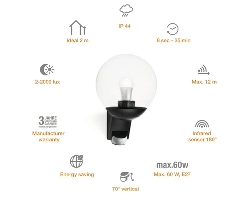 Het is al donker als u thuis komt. Het licht bij de deur schakelt automatisch aan, wijst u de weg en u vindt uw slot direct. De techniek is intelligent geworden. Daarvoor zorgt de nieuwe sensortechnologie in de lamp, die het licht alleen inschakelt wanneer het werkelijk nodig is. Hierbij herkent de ingebouwde sensor of er iemand in het registratiegebied is en schakelt de lamp vervolgens automatisch in. Dankzij de fraai gevormde voet kunt u hem ook als moderne lamp gebruiken. Zodat uw tuin betrouwbaar – en energiezuinig – gelijkmatig en sfeervol wordt verlicht. Iedere nacht weer.